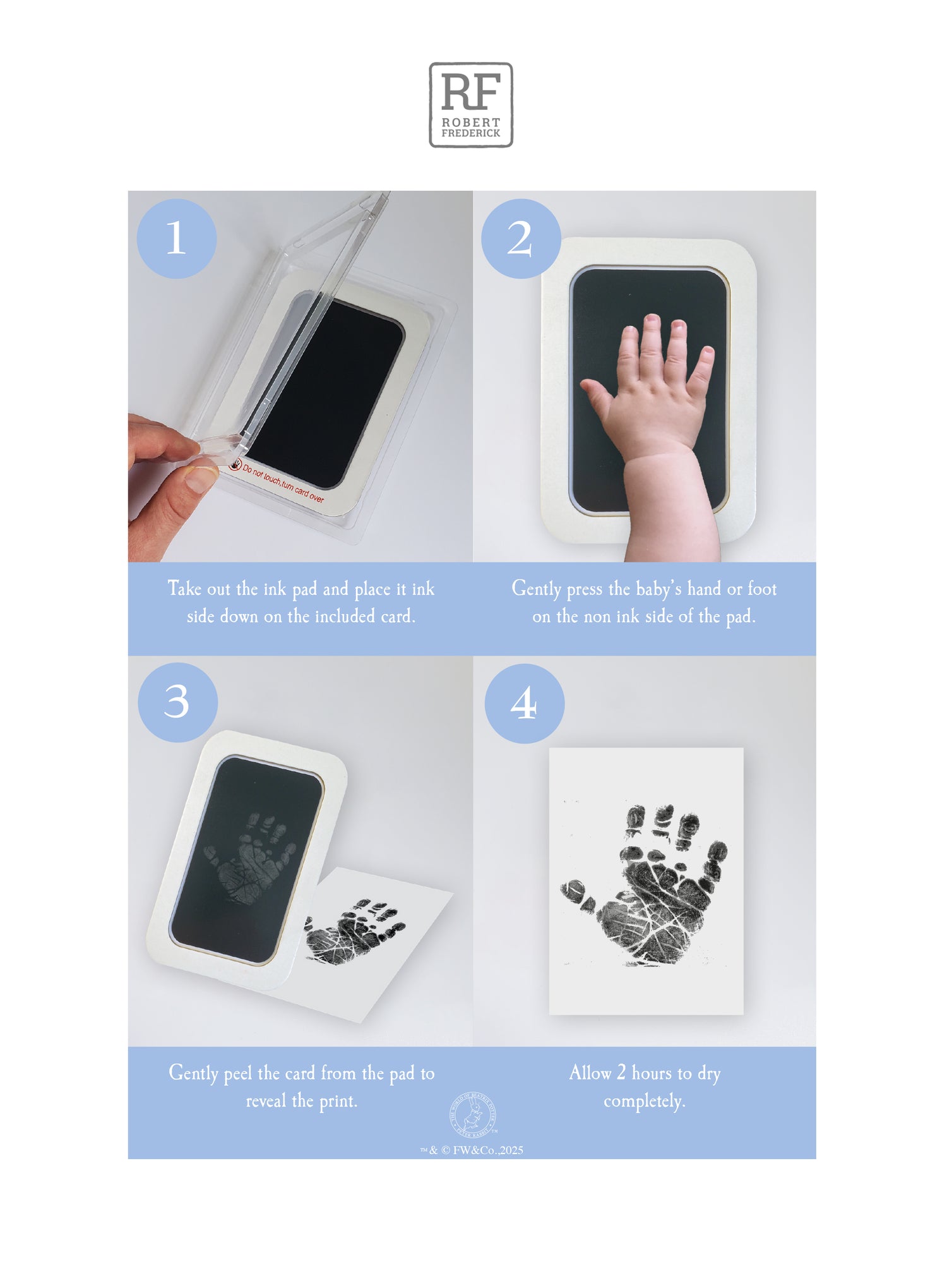 COMPLETE KEEPSAKE KIT: Includes 1 ink pad, 2 imprint cards, and a charming wooden frame with classic Peter Rabbit artwork.