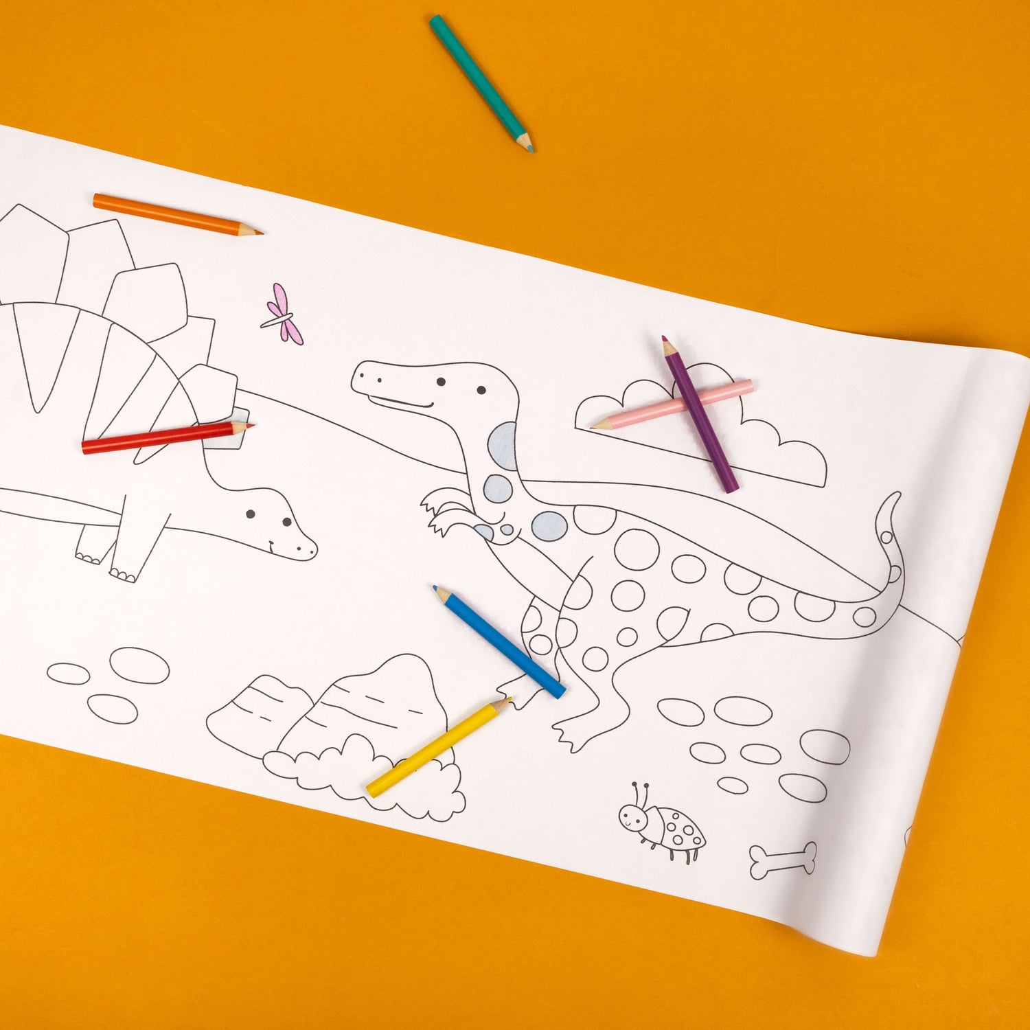 GIANT 3M POSTER FOR DINOSAUR FUN: Unroll this huge 300cm x 30cm poster and enjoy hours of colouring excitement with friendly dinosaur characters.