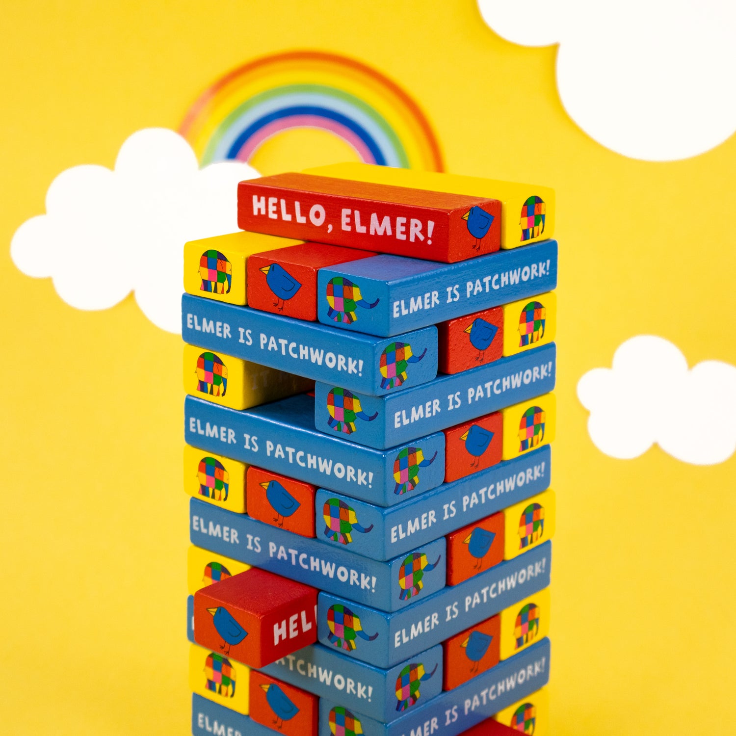Bring family fun to playtime with the Elmer Tumble Tower Game, a colourful wooden stacking game featuring the beloved Elmer the Elephant!