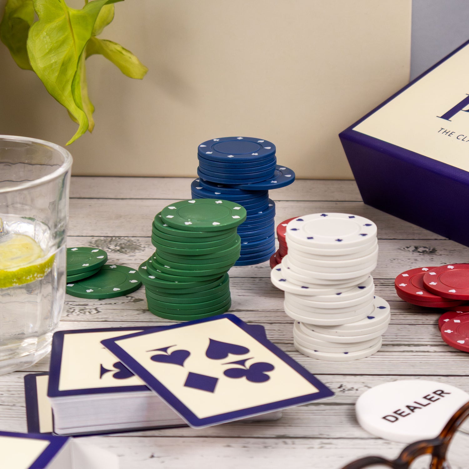 COMPLETE POKER SET: Includes poker chips in multiple colours, a deck of playing cards, a dealer chip, and easy-to-follow instructions.