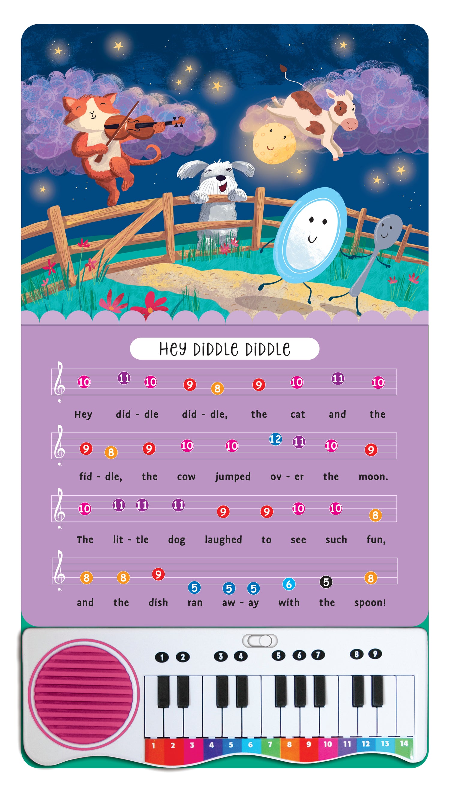 Inside, your little musician will discover seven beloved nursery rhymes, including Hickory Dickory Dock, Hey Diddle Diddle, This Old Man and more. Each song is designed to be played using the numbered, colour-coordinated keys, helping children develop confidence and musical skills as they play along.