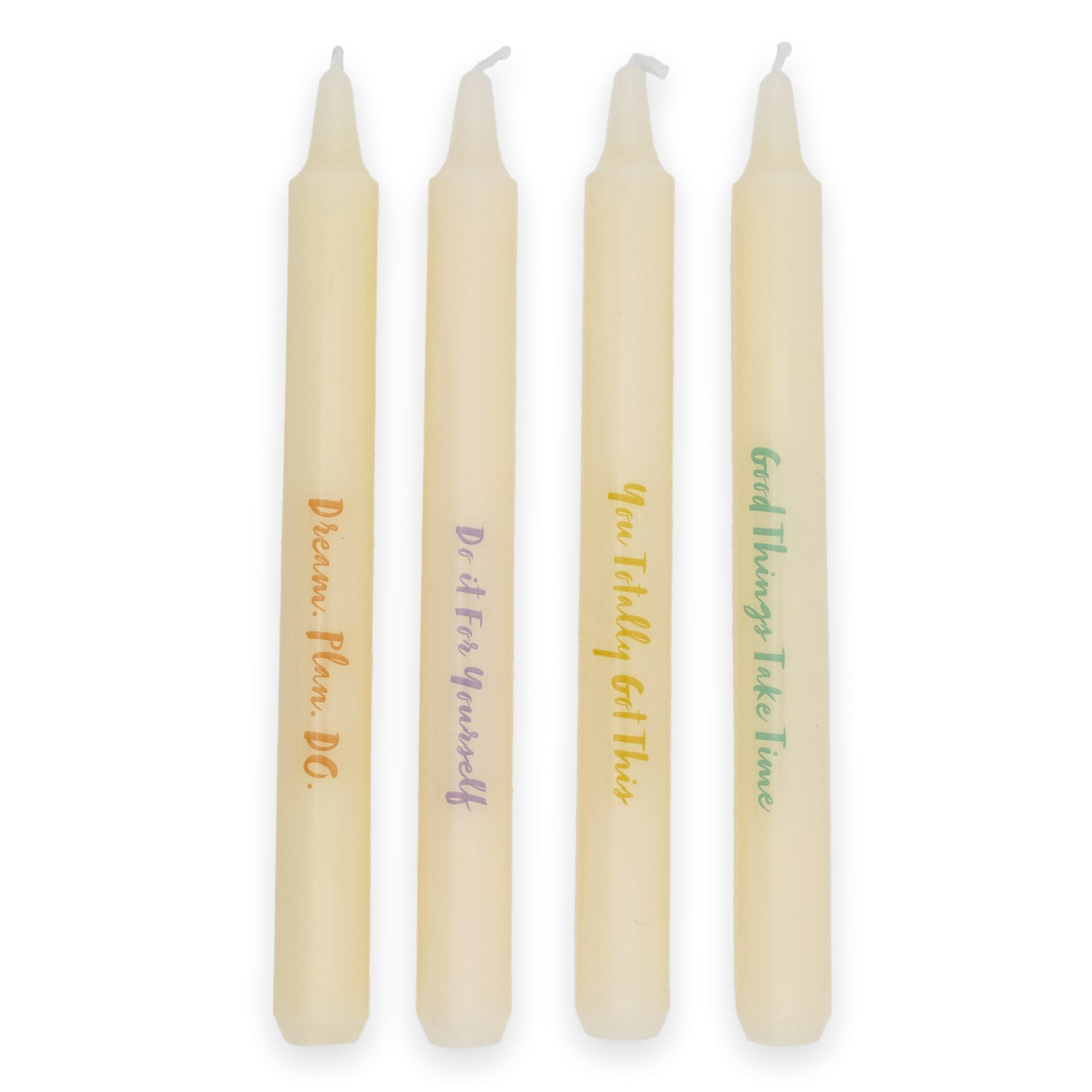 MODERN DESIGN: Our gorgeous Quote Dinner Candles are sure to bring an elegant touch to any table display. The candles each have a quote, "You Totally Got This", "Do It For Yourself", "Dream, Plan, Do" and "Good Things Take Time". The stylish modern design and attention to detail make them a stunning addition to any table setting.