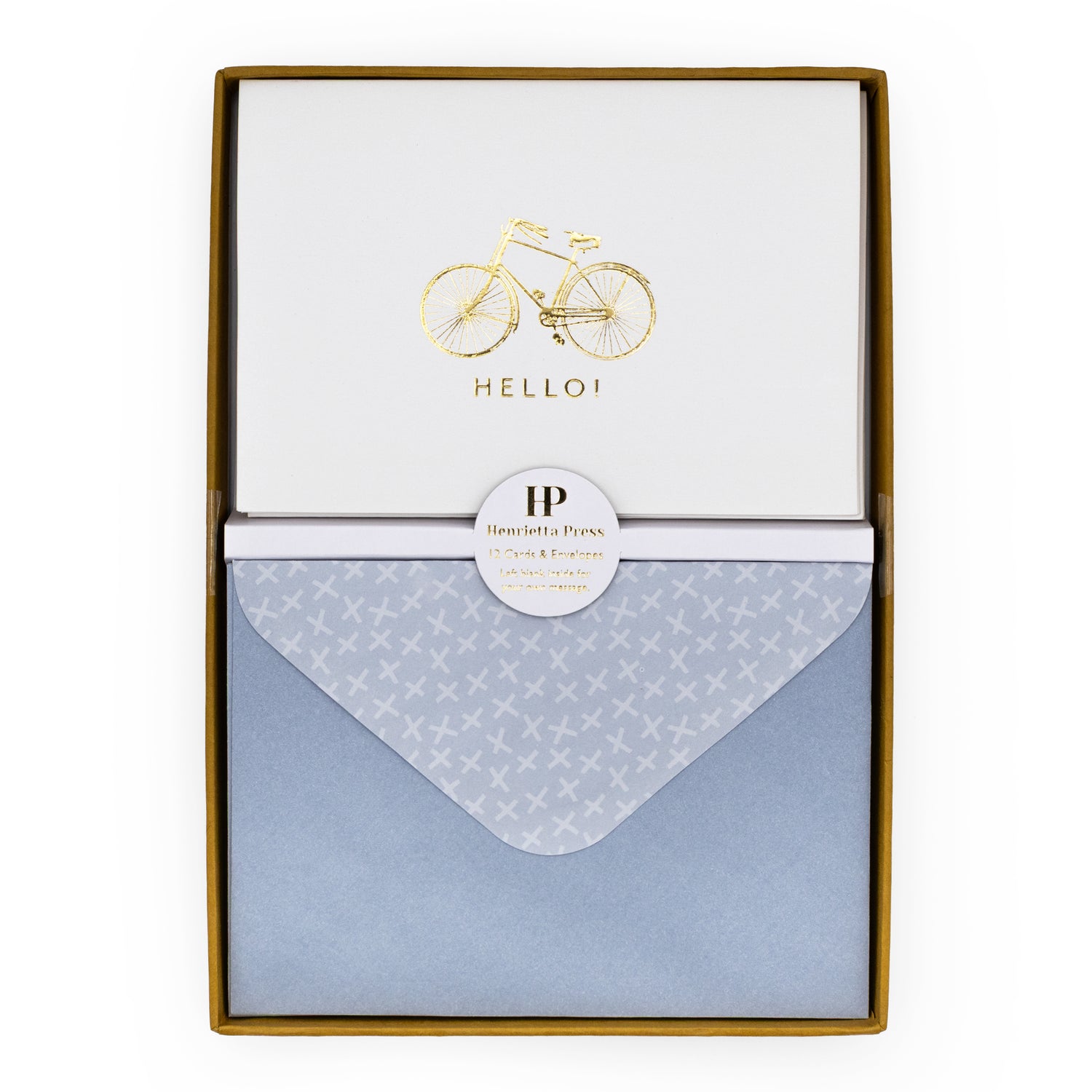Each set includes 12 premium-quality notecards and coordinating blue envelopes presented in a stylish gift box with an acetate cover. The cards feature a gold-embossed bike motif with the words “Hello” and are left blank inside for your own personal message.